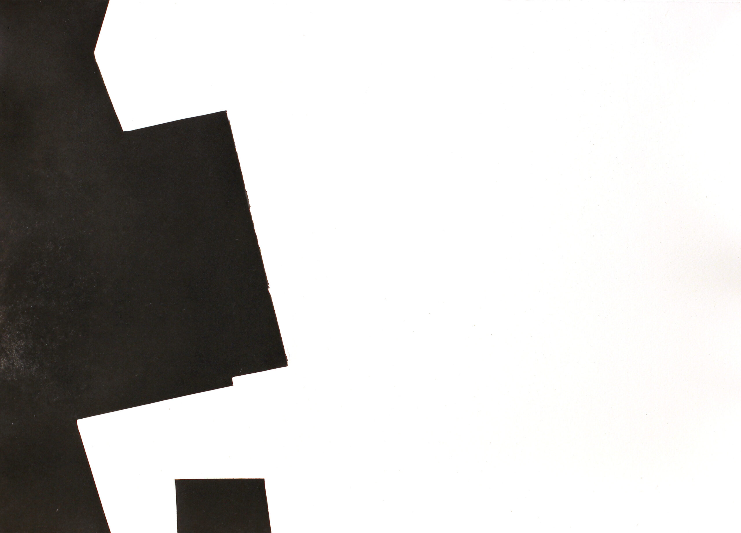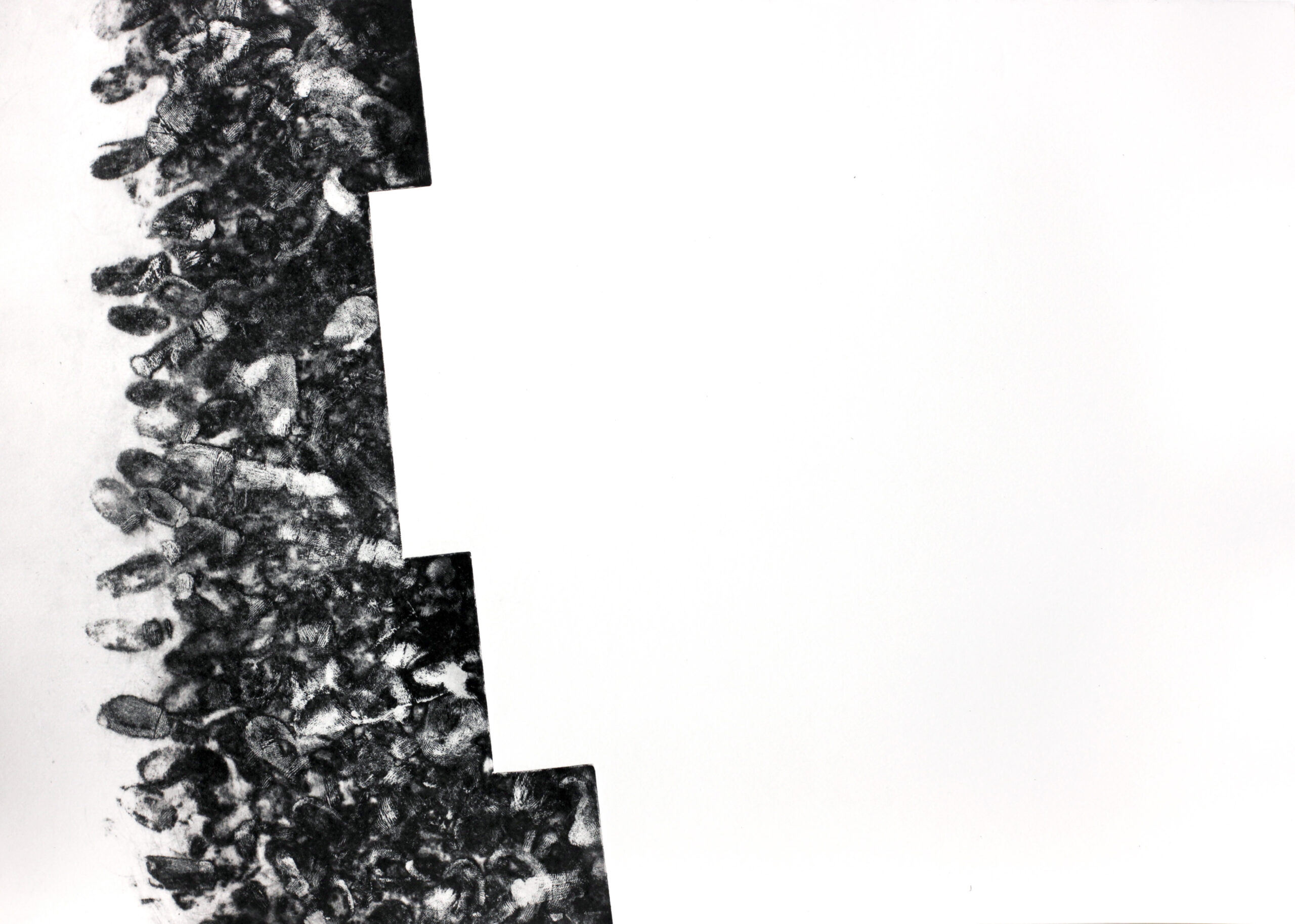 A nyomtatás során, megszokott négyszög formától eltérő alakúra vágott lemezt nem takarta be teljesen a papír, így a lemeznek csak egy, a papír közepe felé eső széle látható. Ez a belső formahatár ütközik a fehér kihagyott felülettel. Grafikáimon a lemez szélével nem ér véget a kép, sőt pont ez alkotja a mű felületének kisebbik részét